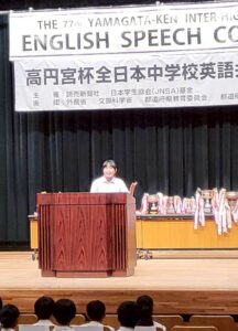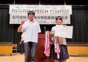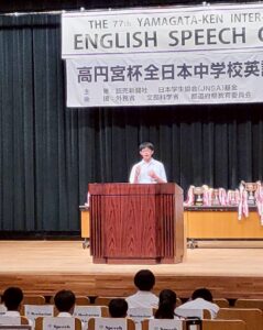令和7年9月26日(金)、山形市の遊学館において、第77回中学校・高等学校英語暗唱弁論大会の山形県大会が行われました。中学校英語暗唱部門で2年生の髙橋羽珠さんが、中学スピーチ部門で3年生の松田蓮音さんが出場し、見事なスピーチを披露しました。そして、暗唱部門で髙橋羽珠さんが見事1位を獲得し、東北大会に出場することになりました。東北大会は11月7日(金)に秋田県大館市で行われます。応援よろしくお願いいたします。